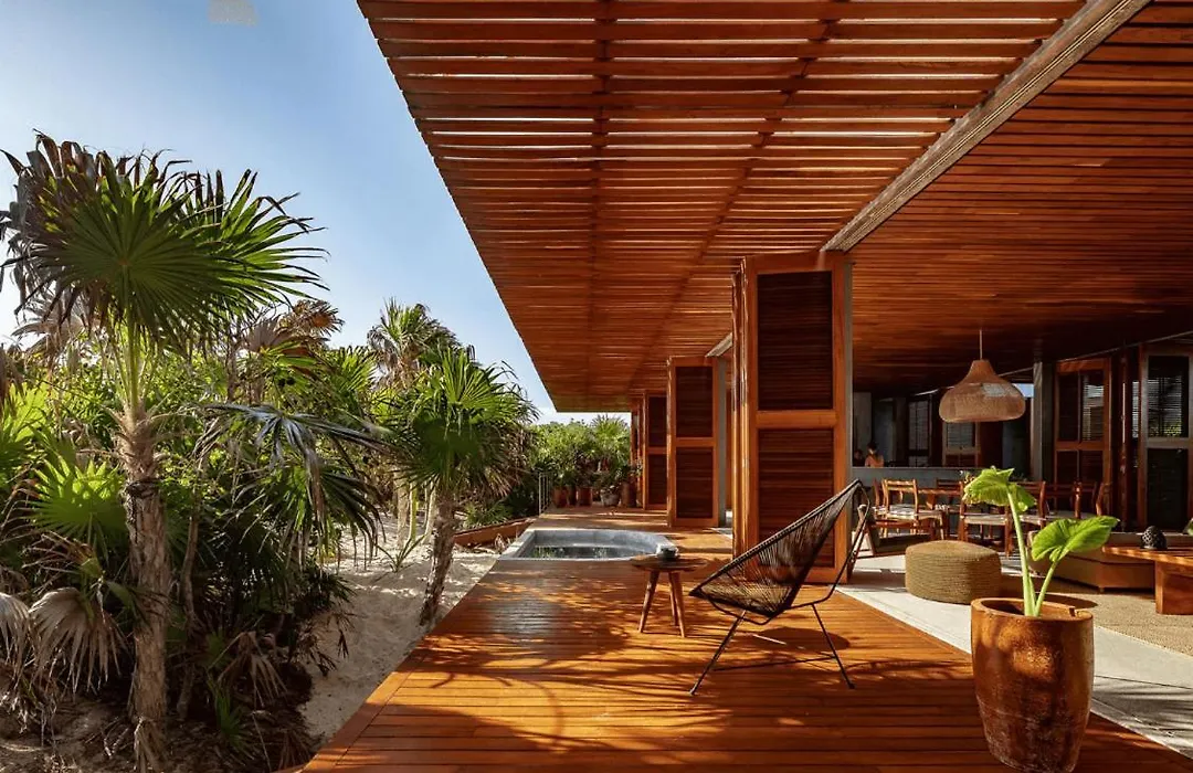 Die 5-Zimmer- Beachfront Sian Kaan Villa 3 Tulum verfügt über eine Terrasse mit Aussicht aufs Meer sowie einen Dachpool.